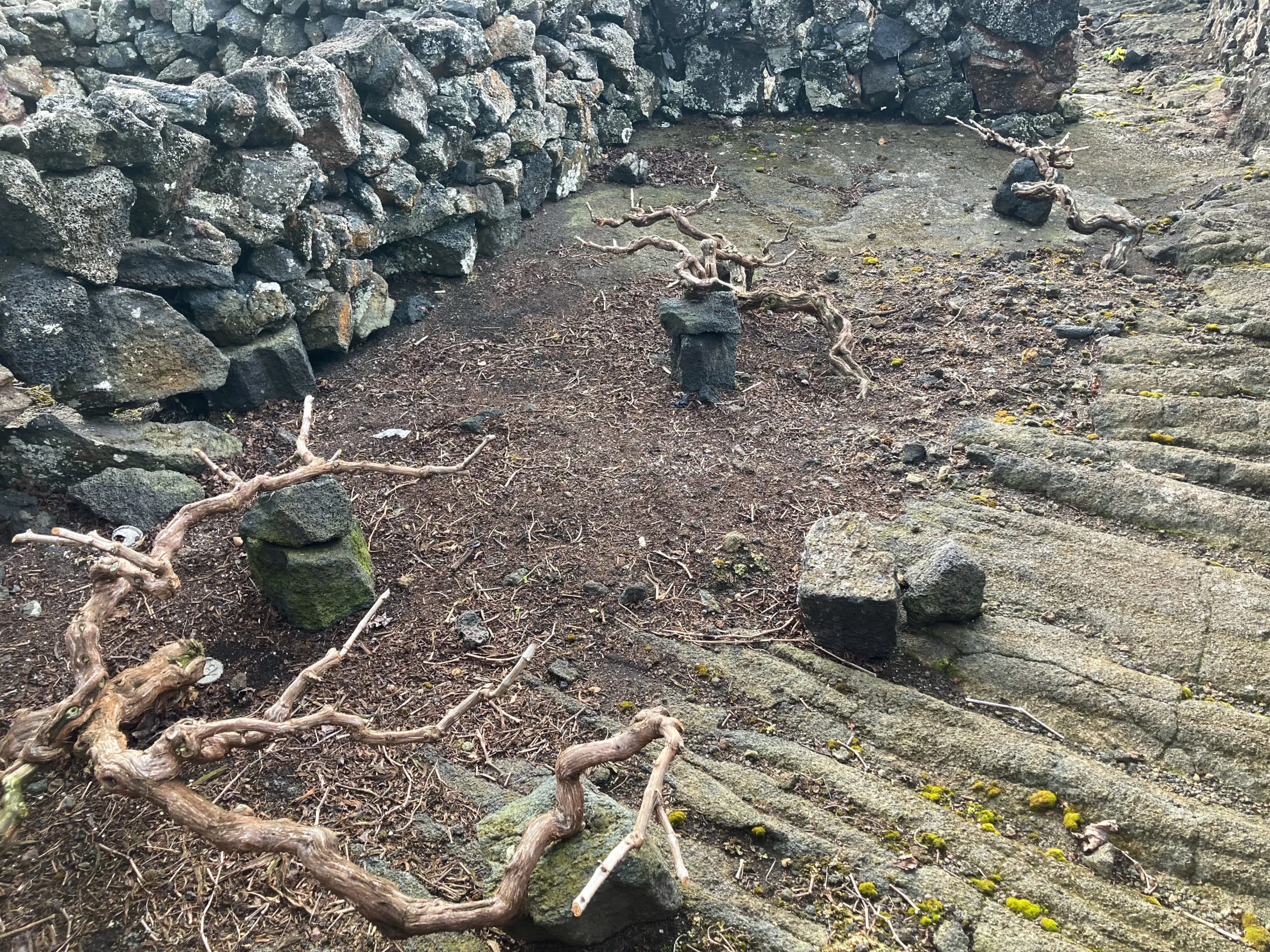 The soil, brough from Faial in small sailboats, was poured into each opening and a vine cutting was planted inside at an angle so it would grow along the ground instead of upright.
